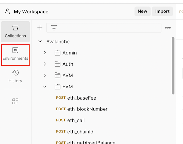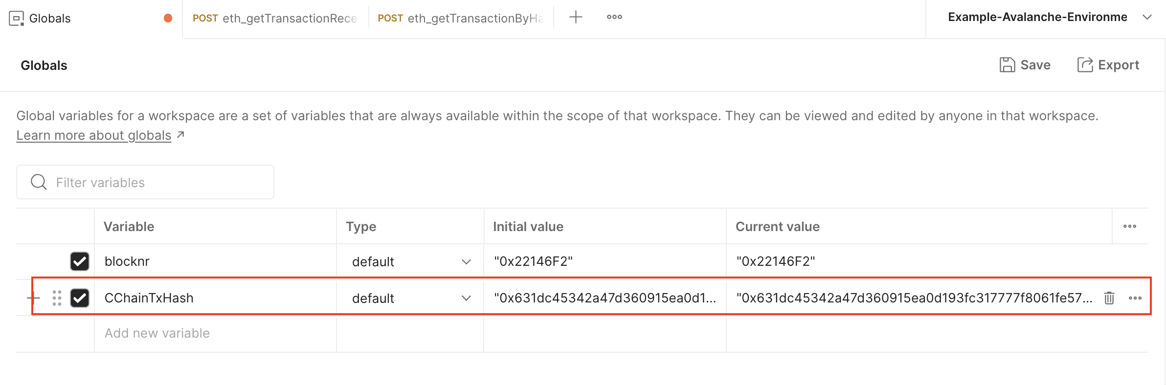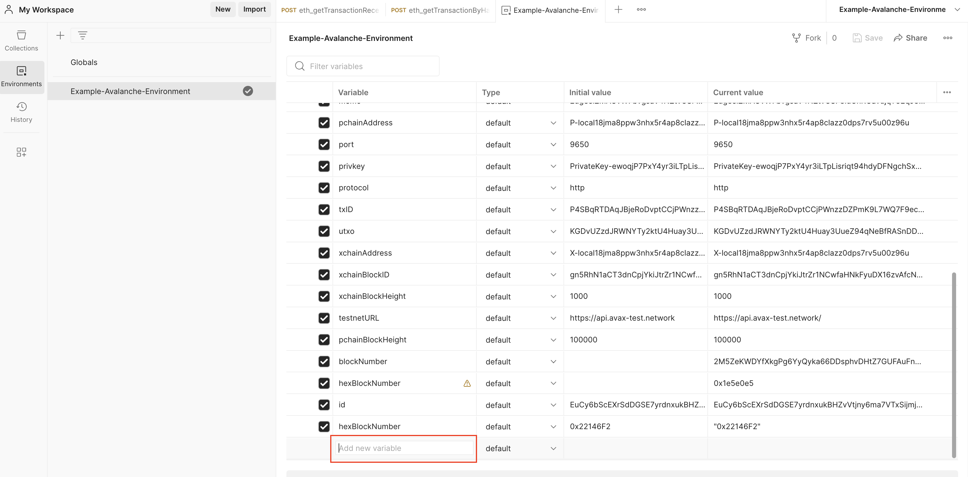 Only default variables are used in the Avalanche Environment file. To learn more about using the secret type of variables, please checkout the Postman documentation.